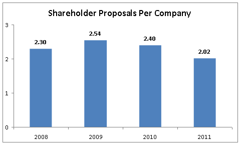 In 2011, the number of shareholder proposals related to corporate governance also fell, on a per-company basis, to 12 percent below 2010 levels and 8 percent below the 2008-2010 average. In part, this decrease is attributable to past successes among shareholder proposals in this category, as the proposals most likely to be adopted have already been embraced by many Fortune 100 companies. These include: proposals requiring a majority of shareholder support for director elections; proposals declassifying boards to require annual director elections; and proposals authorizing shareholders to act outside of annual meetings by written consent or by calling special meetings.