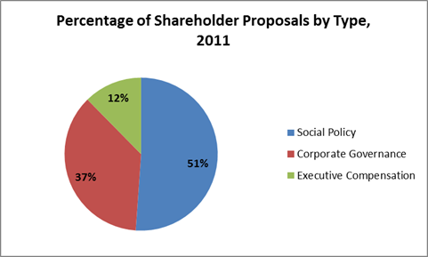 The total number of shareholder proposals introduced per company in 2011 was lower than in any of the prior three years and the percentage of shareholder proposals adopted fell to the lowest level since 2008. However, the number of proposals related to social policy (i.e., unrelated to corporate governance or executive compensation) reached historic highs, driven by an increasing number of proposals devoted to corporations’ political spending. Although no social policy proposal has passed over the past four years, the number of such proposals garnering support from at least 30 percent of shareholders is on the rise. This trend merits ongoing attention. Analysis of future social policy proposals should focus particularly on the subset of such proposals in the political-spending arena.