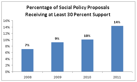 In addition to the change in composition of the pool of proposals related to executive compensation and corporate governance, the increase in proposals related to social policy also helps to explain the 2011 fall in the shareholder-proposal adoption rate. As shown in the earlier graph, social policy proposals in 2011 constituted 51 percent of all shareholder proposals introduced. This represents a substantial increase from the 2008-2010 period, in which such proposals constituted, on average, 38 percent of all proposals introduced. Since no social policy proposal introduced at a Fortune 100 company since 2008 has been adopted, the share of shareholder proposals devoted to social policy substantially affects the average overall adoption rate; indeed, the increased share of 2011 proposals devoted to social policy, on its own, wholly accounts for the drop in shareholder-proposal passage relative to 2010. An analysis of shareholder votes which controlled for type could reveal that there has been increased pressure on boards, notwithstanding the summary-statistic decline.
