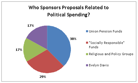 Data from the Proxy Monitor database offer at least some support for Professor Ribstein’s concern that shareholder proposals involving political speech might be advancing the interests of “activist business skeptics” at the expense of ordinary diversified shareholders.[6] As shown in the graph on the right, a plurality of all such proposals were backed by labor union pension funds, with the bulk of the remainder being sponsored by “socially responsible” investment funds and religious and policy groups, each of which has at least some potential political interest separate from share-price maximization.[7] These factors warrant further study, particularly if the number of shareholder proposals continues to increase, and especially if such proposals begin to garner more shareholder support than they have to date.