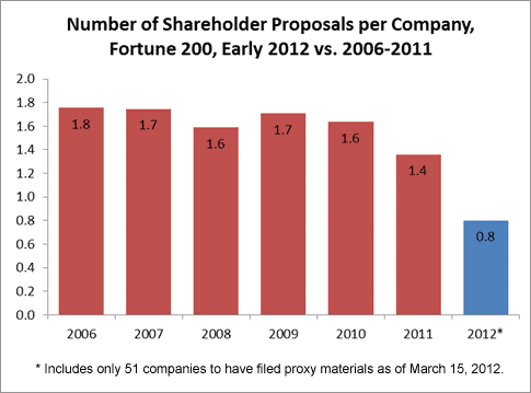 At first glance, as shown in the graph below, the average number of shareholder proposals introduced at Fortune 200 companies thus far in 2012 is below the recent trend line, with only 0.8 proposals filed per company to date this year, versus 1.4 in 2011. When adjusting for the actual companies involved, however, the number of proposals does not vary markedly from that witnessed last year: the 51 companies whose proxy statements were filed as of March 15 only saw 0.88 proposals per company in 2011, versus 0.82 this year—a decrease of only three proposals total.[3] Thus, it appears that 2012 shareholder proposal activity is likely to be similar to that in 2011—slightly below earlier trends, owing primarily to the absence of previously widespread “say on pay” proposals calling for a shareholder advisory vote on executive compensation, a mechanism now mandated under the 2010 Dodd-Frank Wall Street Reform and Consumer Protection Act.[4] (With management now mandated to submit executive compensation to shareholders, there is no need for shareholders who care about this issue to seek a vote that encourages management to implement the practice.)