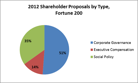 At least at this early stage, there does seem to be some variation in the composition of shareholder proposals introduced in 2012. In 2011, almost 47 percent of all shareholder proposals were unrelated to the company’s executive compensation or the procedural rules of corporate governance but instead concerned social, political, or policy goals such as environmental issues, human rights, or health-care policy. In contrast, such social policy proposals have constituted only 35 percent of all shareholder proposals on corporate proxy ballots this year, and more than half of all proposals have related to corporate governance rules. It will be interesting to see whether this trend continues as more companies’ 2012 proxy materials are distributed.