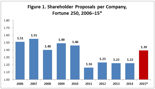As we near the close of corporate America’s “proxy season”—the period between mid-April and mid-June when most large, publicly traded corporations in the United States hold annual meetings to vote on company business, including resolutions introduced by shareholders—a clear picture has begun to emerge. By May 27, 2015, 211 of the nation’s 250 largest companies by revenues, as listed by Fortune magazine and in the Manhattan Institute’s ProxyMonitor.org database (see box), had filed proxy documents with the Securities and Exchange Commission. This report bases its analysis on those companies’ filings, as well as voting results for 186 of those companies that had held their annual meetings by May 22.