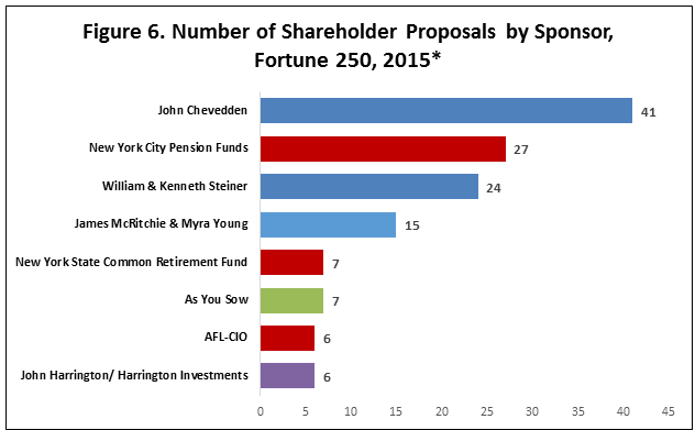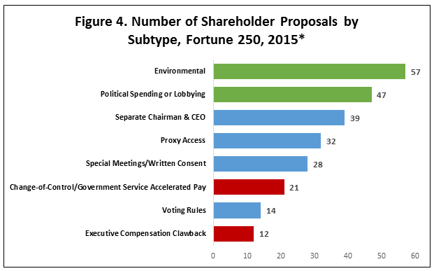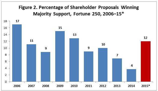Companies are facing more shareholder proposals in 2015. A principal driver of the increase in the number of shareholder proposals is the aggressive campaign being led by New York City Comptroller Scott Stringer, elected in 2013, on behalf of the city’s large pension funds, which control some $160 billion in assets.[3] As a part of what he calls his Boardroom Accountability Project, Stringer has introduced numerous shareholder proposals seeking to grant shareholders with a certain percentage of a company’s outstanding shares the right to nominate directors to the board, with such nominees listed as a voting option on the company’s own proxy statement—i.e., proxy access.[4] In addition, 2015 has witnessed an increase in shareholder proposals, relating to environmental issues, sponsored by social-investing funds.
