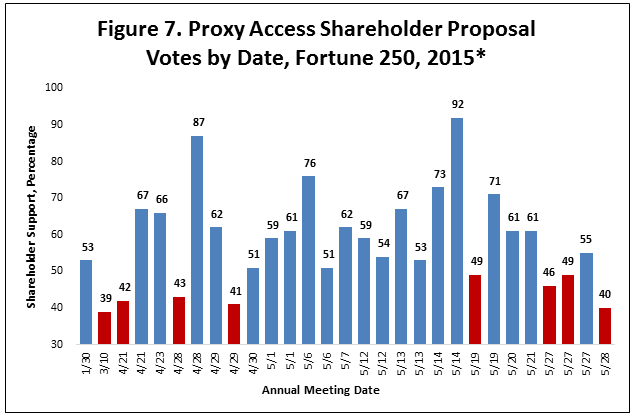 Comptroller Stringer’s proxy access effort has won substantial shareholder support—72 percent of such shareholder proposals coming to a vote by the end of May won the support of a majority of shareholders—such that the percentage of shareholder proposals to win majority backing in 2015 is the highest since 2010. Excluding proxy-access proposals, however, shareholder support for shareholder proposals remains scant: only 3.5 percent of all other shareholder proposals have received majority support, less than in any other year in the ProxyMonitor.org database, dating back to 2006.
