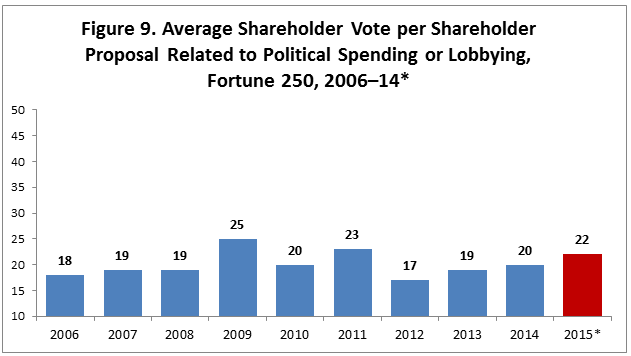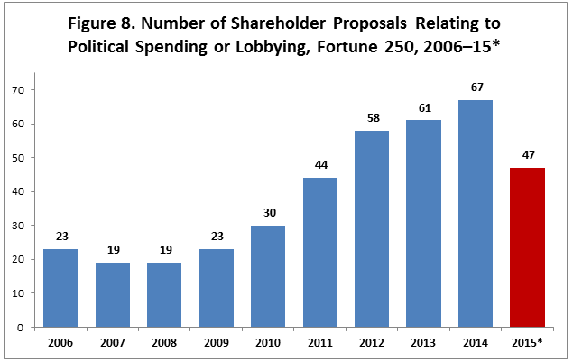 This finding examines these trends in more detail. Section I examines overall shareholder proposal filing and voting results, including the most frequent subjects and sponsors of proposals. Section II looks at voting on the proxy-access proposals. Section III discusses proposals related to companies’ political spending or lobbying, which remain the second-most-common class of proposal in 2015 (behind those involving the environment), even though they have been introduced less often than in recent years.