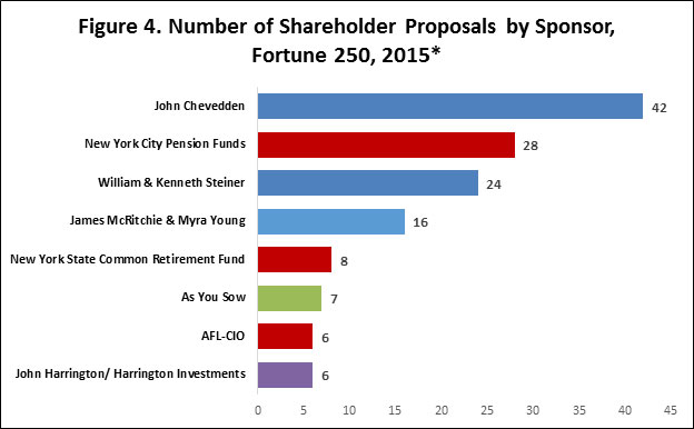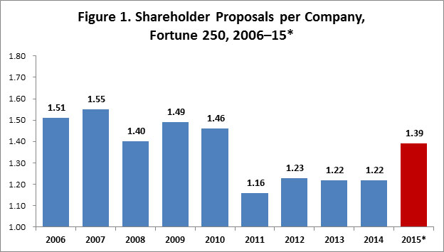 The 2015 “proxy season”—when corporate America holds annual meetings to vote on company business—is now complete: 216 of the 250 largest U.S. companies, by revenues, have held their annual meetings. Two more are calendared for July; the remainder will meet later in the year.