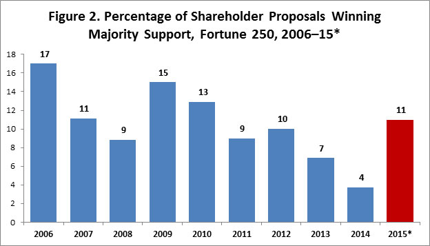 - 11 percent of shareholder proposals received majority votes, the highest percentage since 2010.