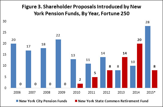 Although it is too soon to assess the impact of Comptroller Stringer's push for proxy access, we can evaluate shareholder-proposal activism by state and municipal public employee pension funds in previous years. From 2006 to the present, state and municipal pension funds have sponsored 300 shareholder proposals at Fortune 250 companies. More than two-thirds of these were introduced by the pension funds for the public employees of New York City and State.