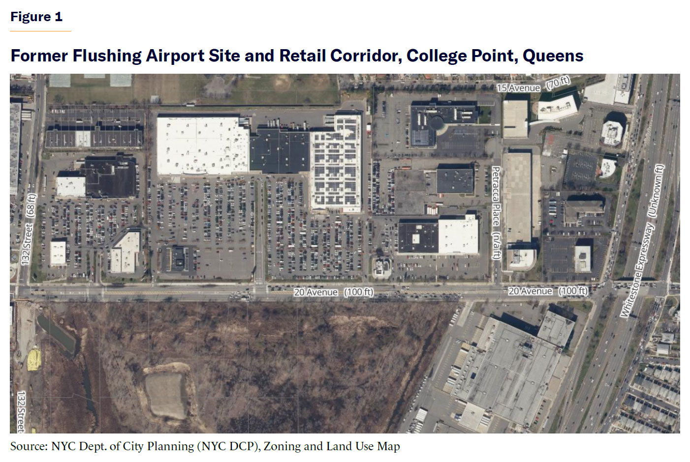 Across 20th Avenue from the vacant former airport site, however, is a line of manufacturing-zoned large shopping centers with vast parking fields (Figure 1). At least as many new housing units could be developed on those sites. Mamdani’s administration should seize the opportunities here and in other locations rather than maintaining unattractive and underutilized exclusively retail sites.
