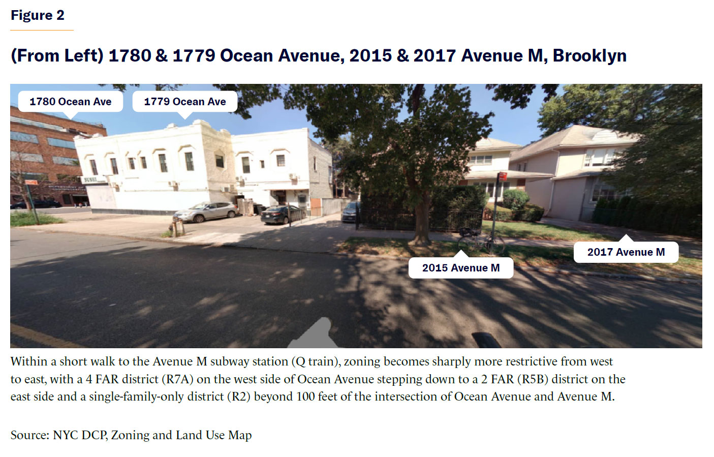 About 15% of NYC’s land area is zoned for single-family homes only.[45] Some of those areas are environmentally sensitive, or subject to flood hazards, and should have restrictions on development. However, in many areas, single-family development restrictions simply indicate the past political clout of affluent homeowners. Allowing small numbers of additional units on each lot would create investment opportunities for property owners and allow for more housing choice for New Yorkers, without creating adverse land-use impacts (Figure 2).