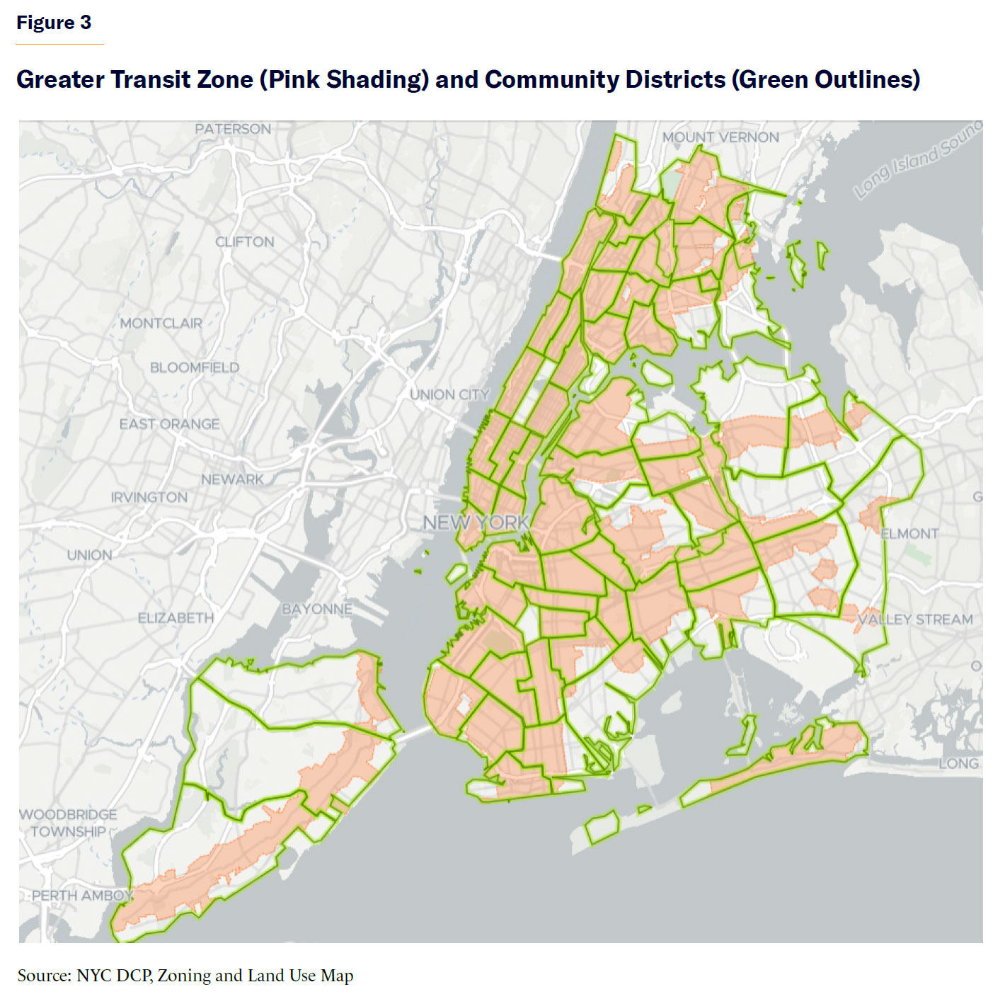 Unlike the Ballot Question 3 expedited process, this one is not constrained by prospect of environmental review, allowing proposals for higher densities in currently low-density districts even if significant environmental impacts are possible. However, because of the political constraints of maintaining a working majority on the council, the scale of new affordable housing projects is likely to be moderate. Importantly, the Greater Transit Zone—the area close to subways and commuter rail lines designated under COYHO for special zoning rules that allow more floor area in new residential buildings and less off-street parking—exists in every community district (Figure 3). That designation provides likely target areas for zoning changes that facilitate new affordable housing developments. In these areas, low-income residents are more likely to be able to access employment and services without needing to own a car. For example, in a 2022 Manhattan Institute report, I flagged the potential for new housing development in two areas within the Greater Transit Zone in Staten Island Community District 2: Grasmere and the New York City Housing Authority’s Berry Houses campus.[50]