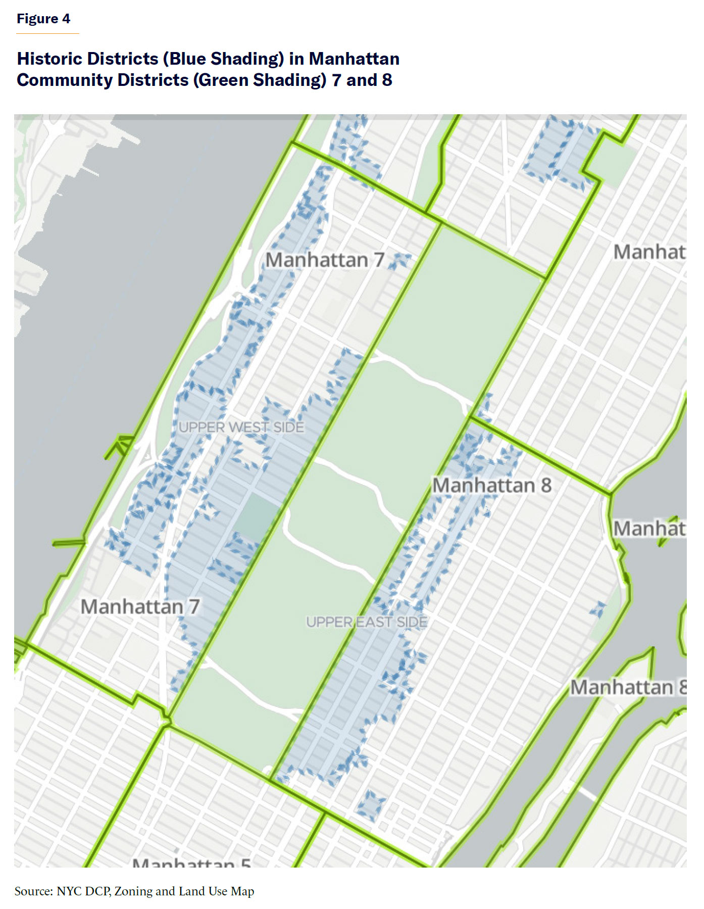 The three potential Manhattan community districts include District 5 (Midtown), 7 (Upper West Side), and 8 (Upper East Side). Potential zoning changes for Midtown are discussed in the next section of this report, but because these changes would require amendments to the text of the zoning resolution modifying the terms of the Mandatory Inclusionary Housing (MIH) program, they would not be eligible for the fast-track process. In the 2022 report, I also suggested zoning changes that could facilitate new housing in Community District 8. The referenced zoning map amendments would be eligible for the fast-track review process. In Community District 7, potential zoning map changes that would facilitate significant new housing construction would, in some cases, also require reconsideration of historic-district boundaries. These are also extensive in Community District 8 (Figure 4).