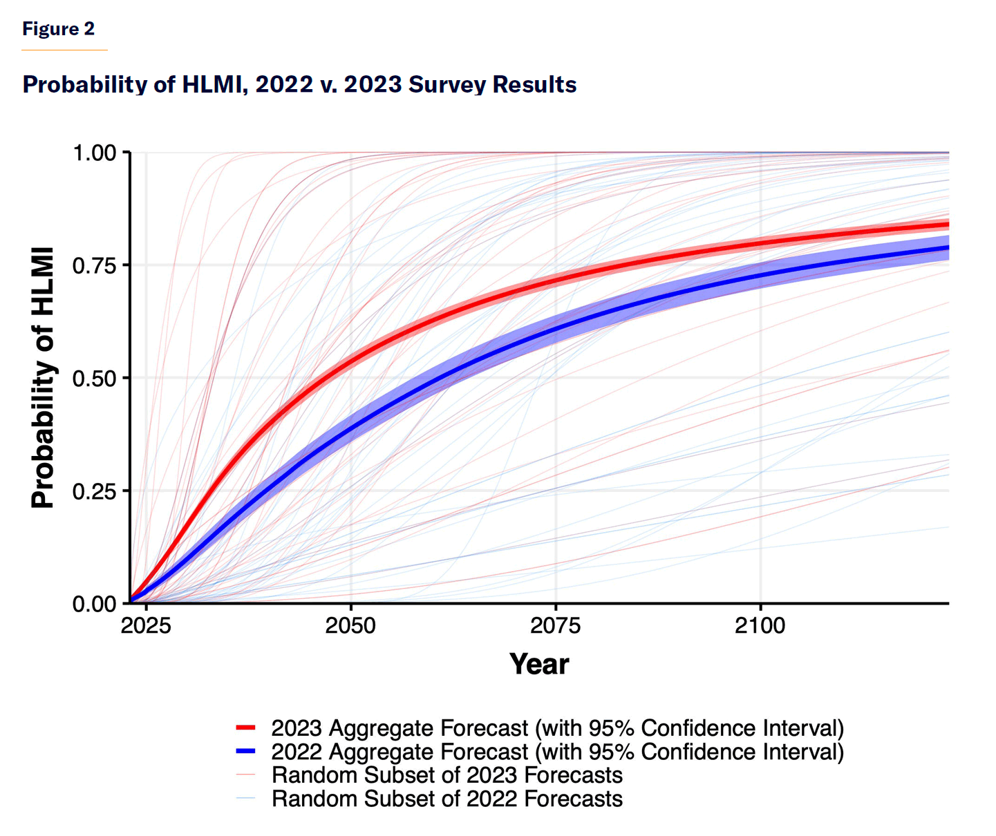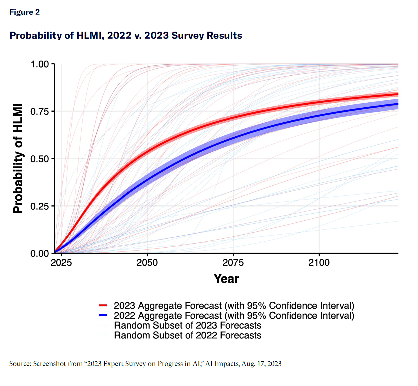 Scaling laws suggest that highly advanced AIs—even ones that we might call true artificial general intelligence—might arrive without fundamental breakthroughs. According to surveys of AI experts, many researchers have become more convinced that “high level machine intelligence”[29] (HLMI) will arrive soon, and they are shortening their time-frame estimates in subsequent surveys (Figure 2). Leaders of labs seem to be even more bullish, with most stating the possibility of HLMI or AGI being created within the decade.