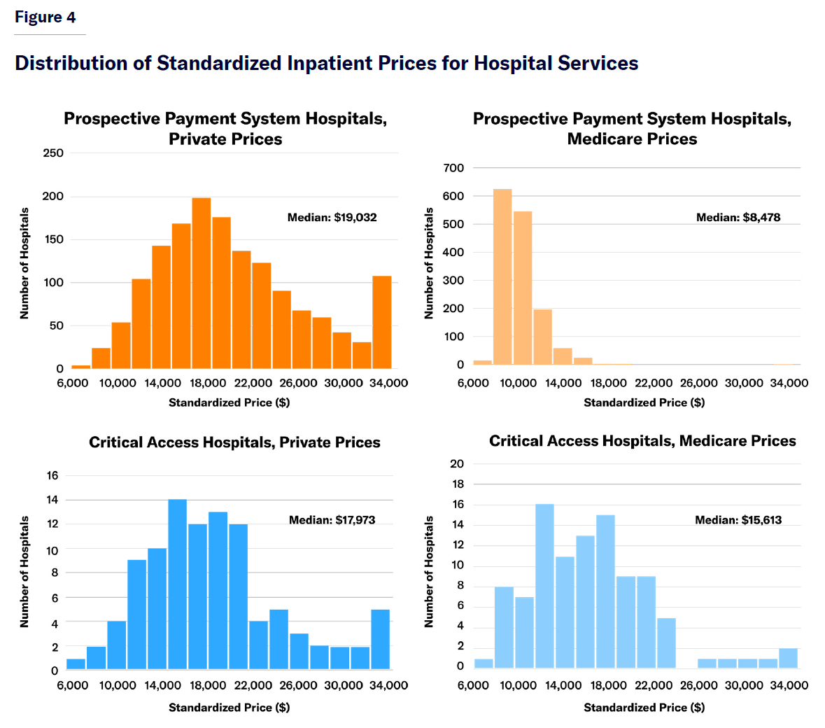 Critical Access Hospitals are paid similarly to other hospitals by private insurers. But whereas Medicare pays other hospitals much less than private insurance, it pays CAHs about the same as private insurers do. As a result, Medicare on average pays CAHs much more than it does other hospitals, with some CAHs being paid four times as much as standard Medicare rates (Figure 4).