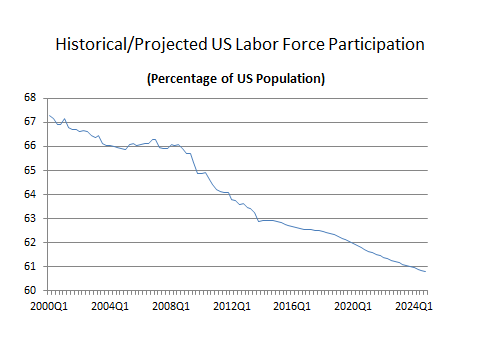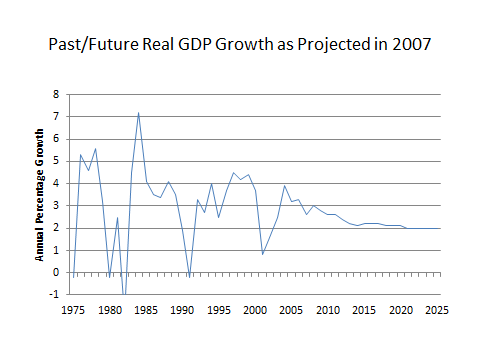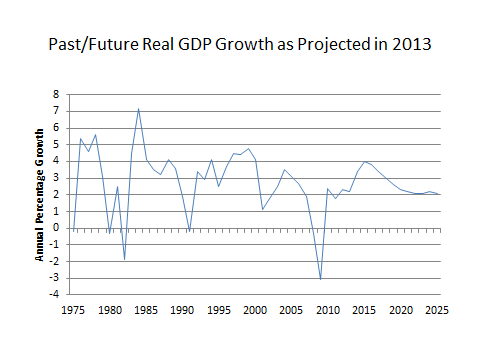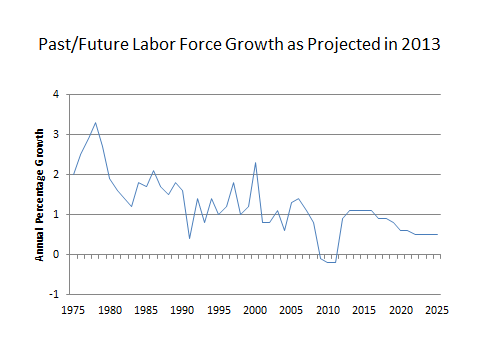 Unfortunately, what has happened is that the labor force has shrunk much more than anticipated then. The number of workers dropped through the floorboards, and economic growth fell alongside (see the 2009 plunge in the next two graphs). The current expectation – some would say hope – is that these will rebound in the middle of the current decade, but by nowhere near enough to offset recent damage both to the labor force and to the economy.