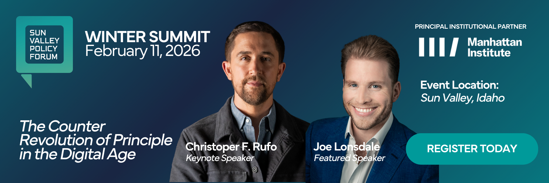 The Manhattan Institute is proud to serve as the Principal Institutional Partner for the Sun Valley Policy Forum’s 2026 Winter Summit in the iconic resort town of Sun Valley, Idaho on February 11, 2026. We are thrilled to join Joe Lonsdale and MI senior fellow Christopher F. Rufo for an evening on principled leadership and the future of American institutions in an AI-driven era.