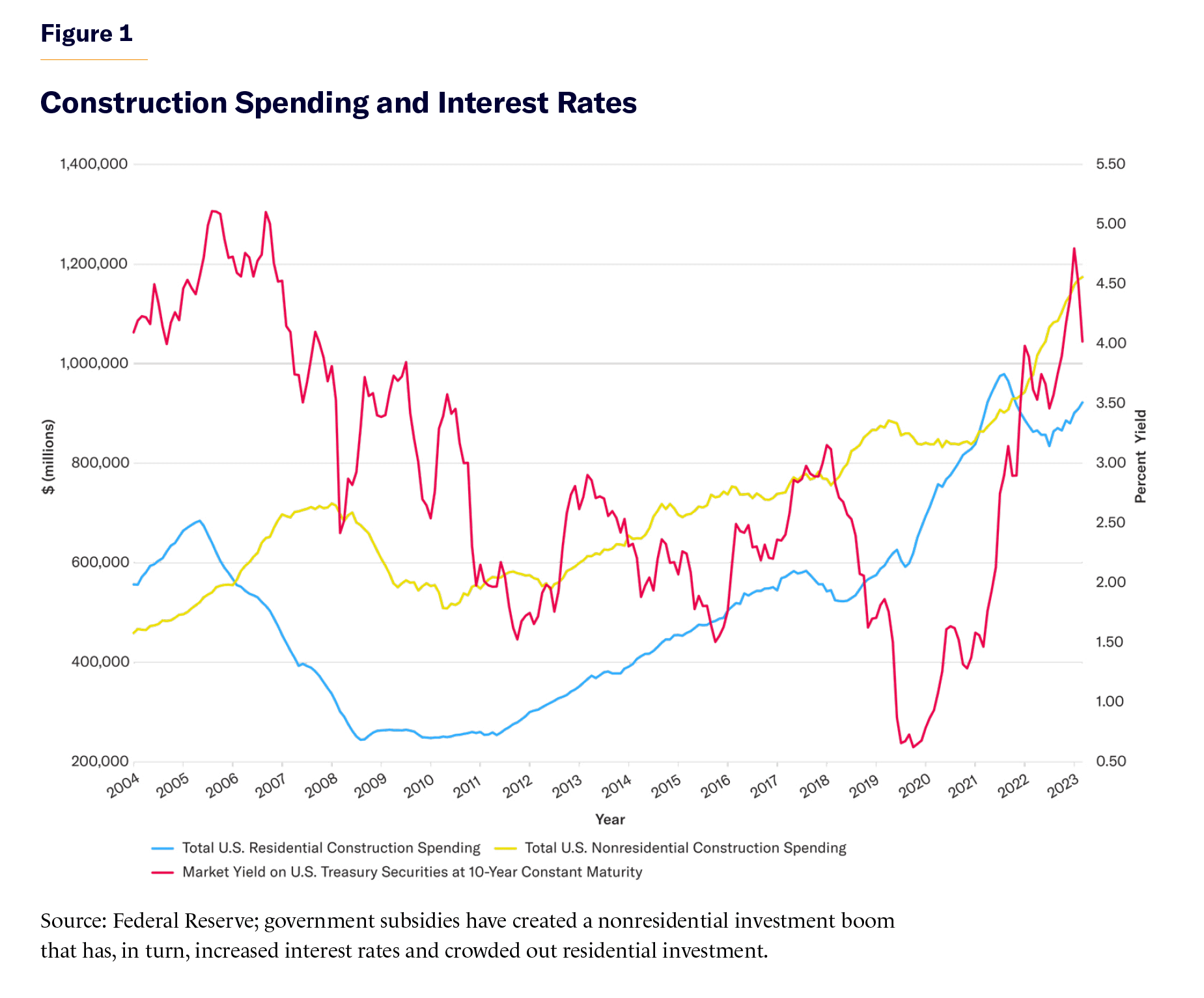 When the government pays industry to build factories for IRA-favored activities, such factories will be built; indeed, nonresidential construction activity has increased by over $100 billion in the last year (Figure 1). However, absent a major recession, significant idle resources are not sitting around waiting to be used, so that construction has necessarily come from reduced economic activity elsewhere, a process known as “crowding out.” Government borrowing to fuel this building bonanza has helped push interest rates to the highest levels since 2007, making it difficult for anyone not receiving government subsidies to borrow and invest.