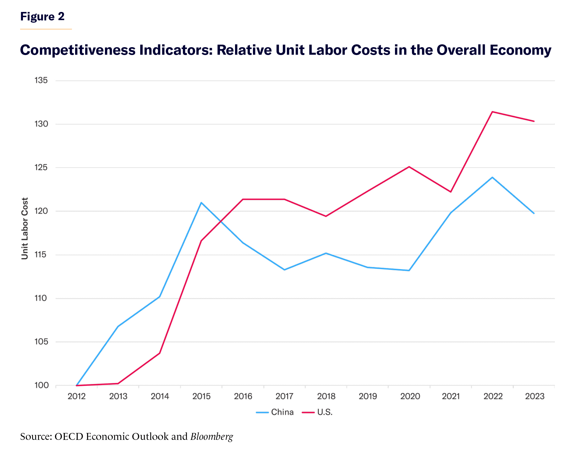 These extra costs will exacerbate the problems that can be seen in Figure 2, which compares unit labor costs—how much labor a unit of GDP costs to produce—in America and China. In the last 10 years, the currency-adjusted amount of American labor required to produce a given amount of goods and services has gone up by about 29%, while the amount of Chinese labor required has gone up by only 12%. Manufacturers derive significant cost savings from producing in China, where labor costs were already lower at the beginning of this period and have not risen nearly as much.