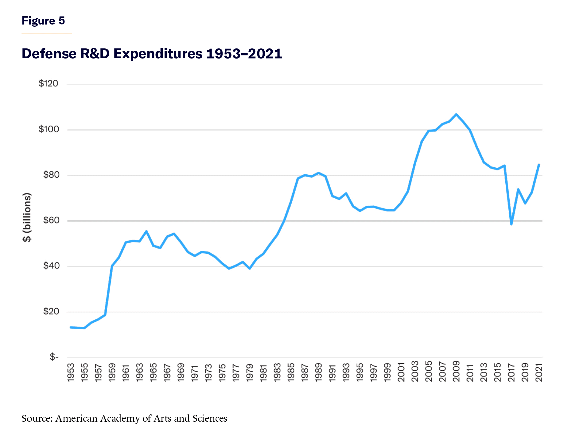 Yet, as of 2021, total expenditures on defense R&D were barely higher than they were in the 1980s in real terms, despite the economy being almost 2.5 times the size (Figure 5). Our expenditures as a share of GDP have plummeted.[66] Defense R&D’s share of the federal budget has declined by about 75% since the 1960s,[67] and overall government R&D has declined from almost 2% of GDP to about 0.6% over the same period.[68]