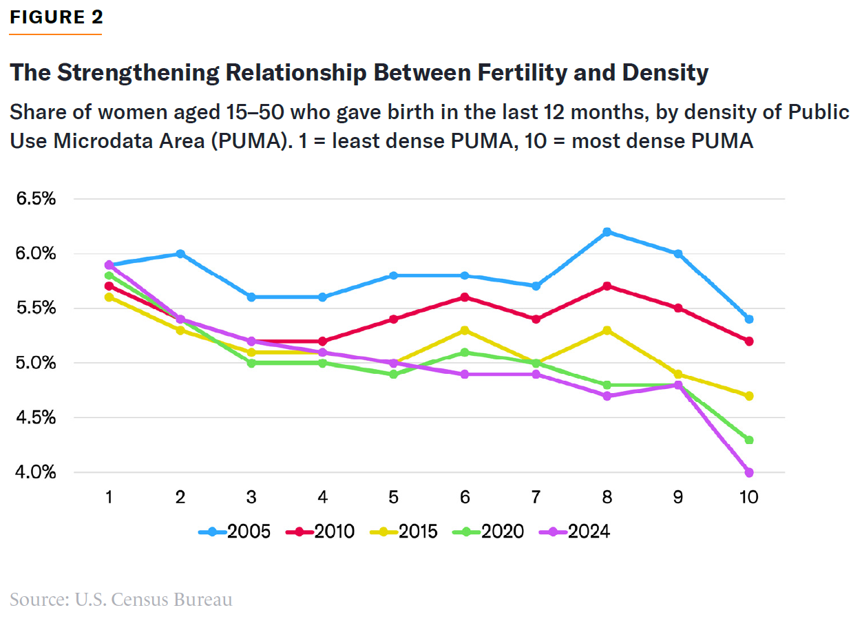 Out-migration was one cause of such large declines. But falling fertility also contributed. Birthrates have been in long-term decline across the country, but in recent years have fallen much faster in large cities than in less urban parts of the country. In large urban counties, birthrates are down 18% since 2010 (Figure 1). Indeed, the relationship between fertility and density has grown stronger over the last two decades, as birthrates have fallen fastest in the most densely populated parts of the country (Figure 2).