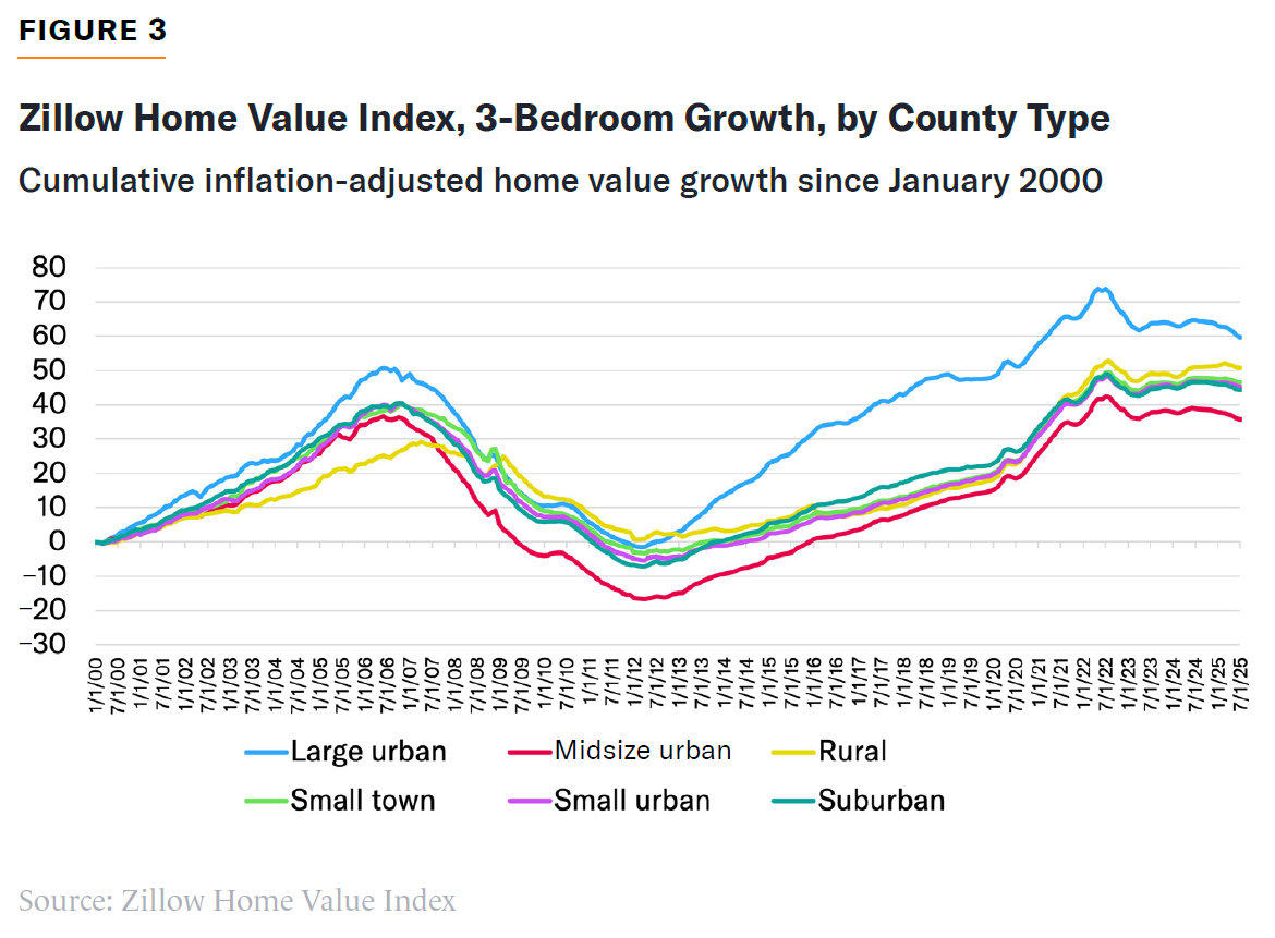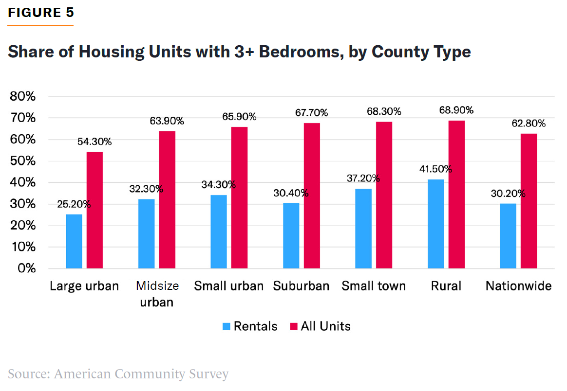 The cost of housing types conducive to family formation is on the rise nationwide, but it has risen faster in the country’s largest cities than in other types of places. Since 2000, the average price for a three-bedroom house or condo has risen 60% in large urban counties, faster than in any other county type (Figure 3). National polling finds that families with kids would prefer to trade off common space for additional bedrooms. Yet developers and public officials are undersupplying these types of units, partly because of regulatory barriers that add costs to family-friendly layouts.[2]
