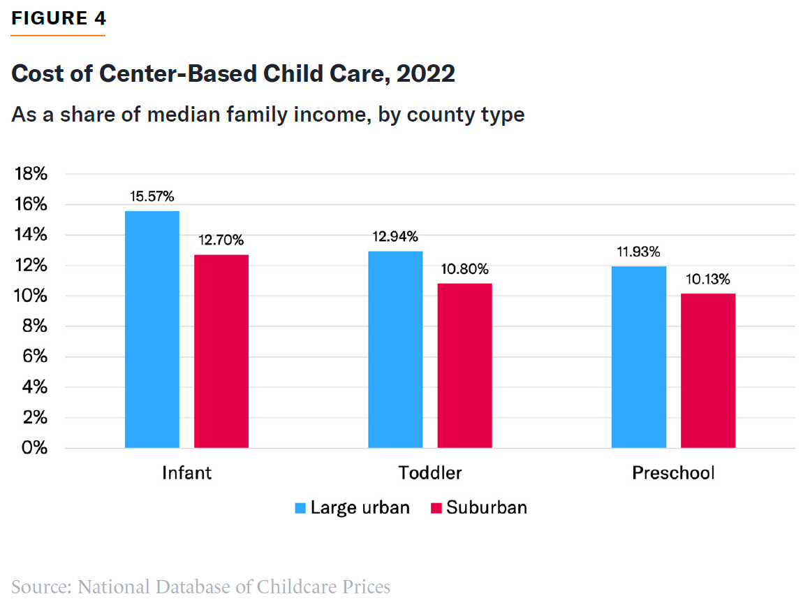 Families choosing large cities over suburban communities can expect to pay a higher share of their income for center-based child-care arrangements. In a typical large urban county, the median family will pay nearly 16% of its income for infant child care, compared with less than 13% in suburban communities (Figure 4).[3]