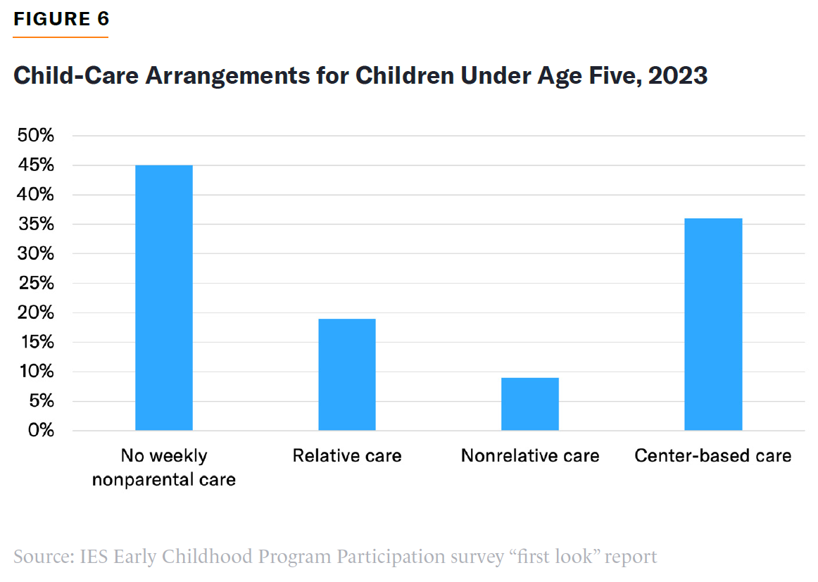 Cities should not lose sight of the fact that, nationwide, less than 40% of families with children under five rely on formal, center-based child-care arrangements (Figure 6). Addressing rising child-care costs means not just reducing the cost of center-based care but solving problems faced by families using other kinds of child-care arrangements.[30] In cities with voucher programs, eligibility should include nontraditional, home-based, and part-time options that fit with the diverse set of families’ preferences and scheduling constraints. Designing policy around families’ actual child-care preferences can bring new providers into the system, boosting affordability and reliability.