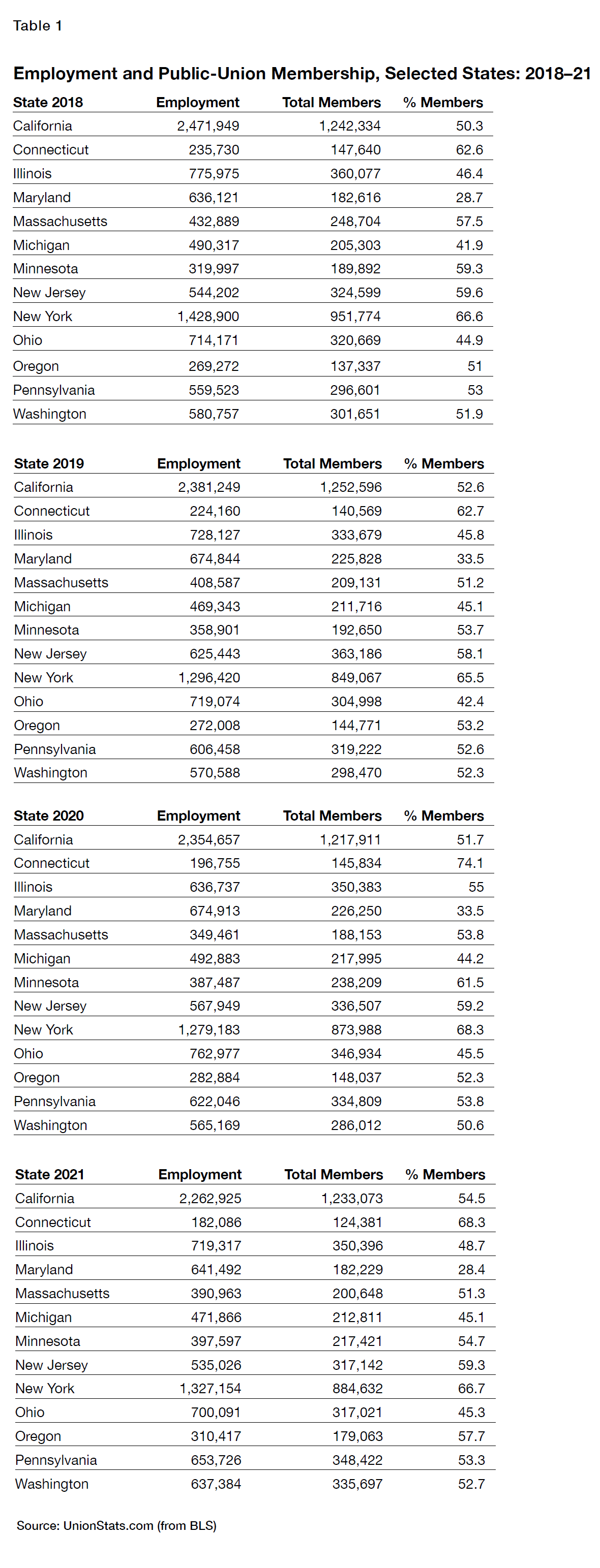 All that said, UnionStats data suggest that, from 2018 to 2021, strong union states affected by Janus experienced slight increases in union membership, while others experienced slight declines. But the devil is, as always, in the details. Public-union membership in California went from 50.3% in 2018 to 54.5% in 2021. But that higher percentage masks a reported fall in total members because the size of the California public workforce dropped by nearly 200,000 employees, according to BLS data. Public-union membership in New York, on the other hand, saw a tiny increase in this period, from 66.6% to 66.7%, while the size of the public workforce apparently dropped by about 100,000 workers. Therefore, the Empire State had 951,774 public-union members in 2018 but only 884,632 in 2021. Similarly, the percentage of public-sector workers who were members of a union in Ohio experienced a small increase, as public employment declined by a small amount (Table 1).