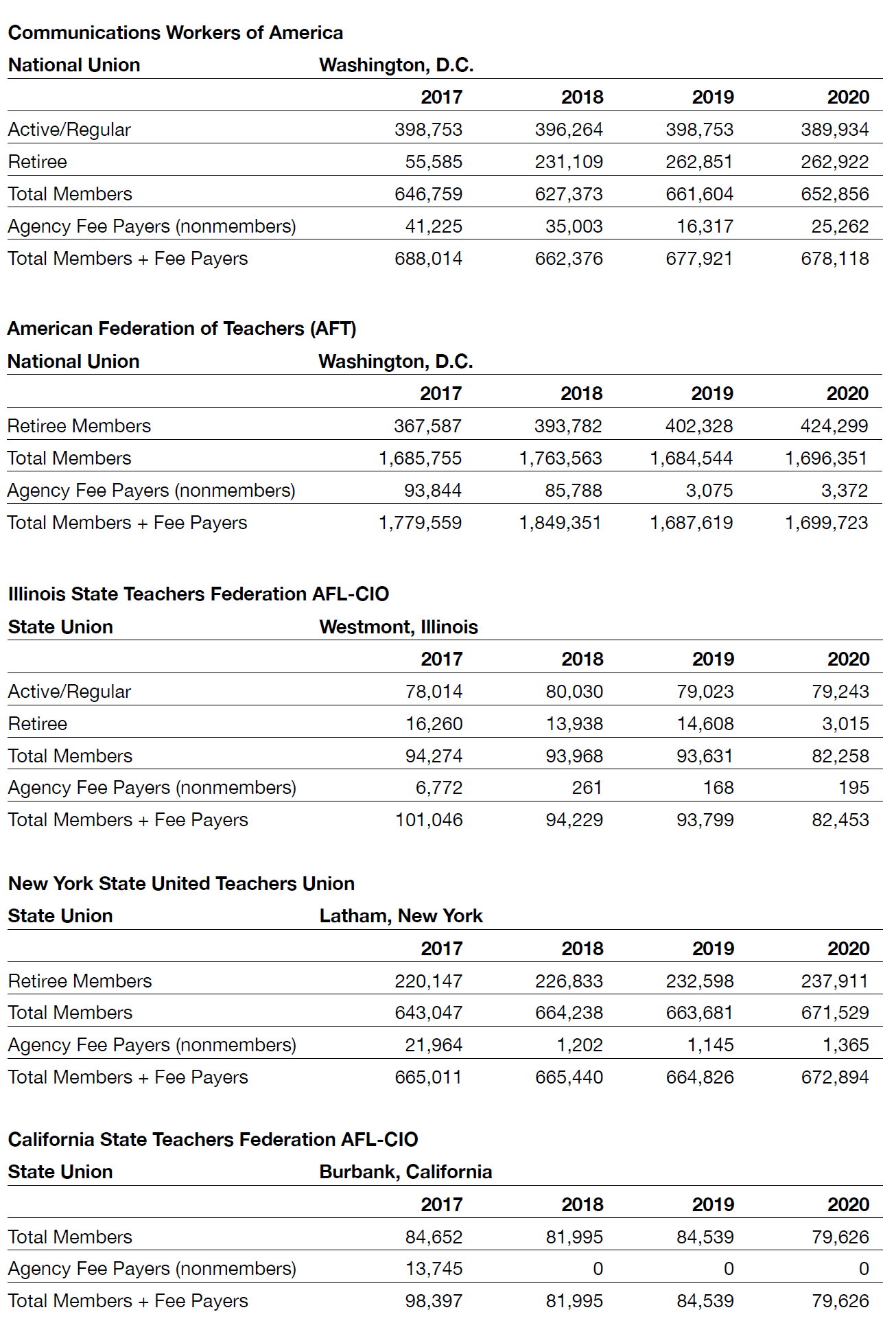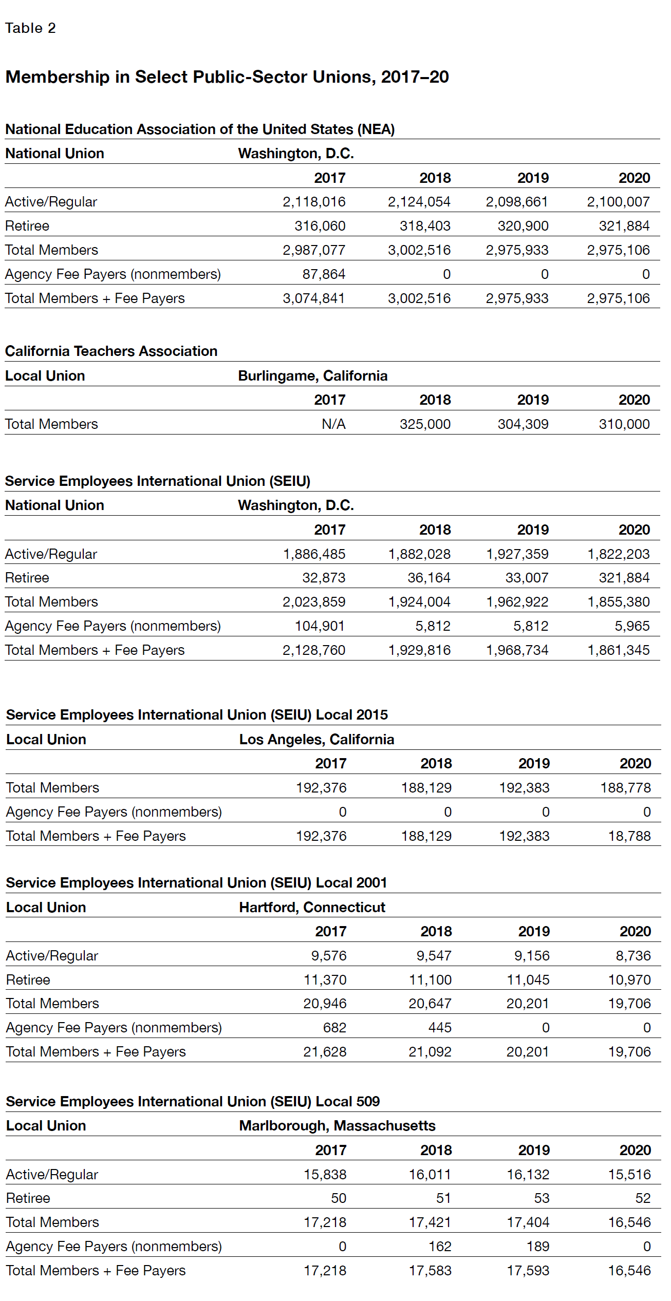 The picture that emerges is one of overall stability with small declines or slight increases in the number of union members. AFSCME, for example, reported a tiny gain of about 4,000 members between 2018 and 2020 (increasing from 1,023,603 to 1,027,437). NEA, however lost some 24,000 active professional members (declining from 2,124,054 to 2,100,007) over the same period (Table 2).