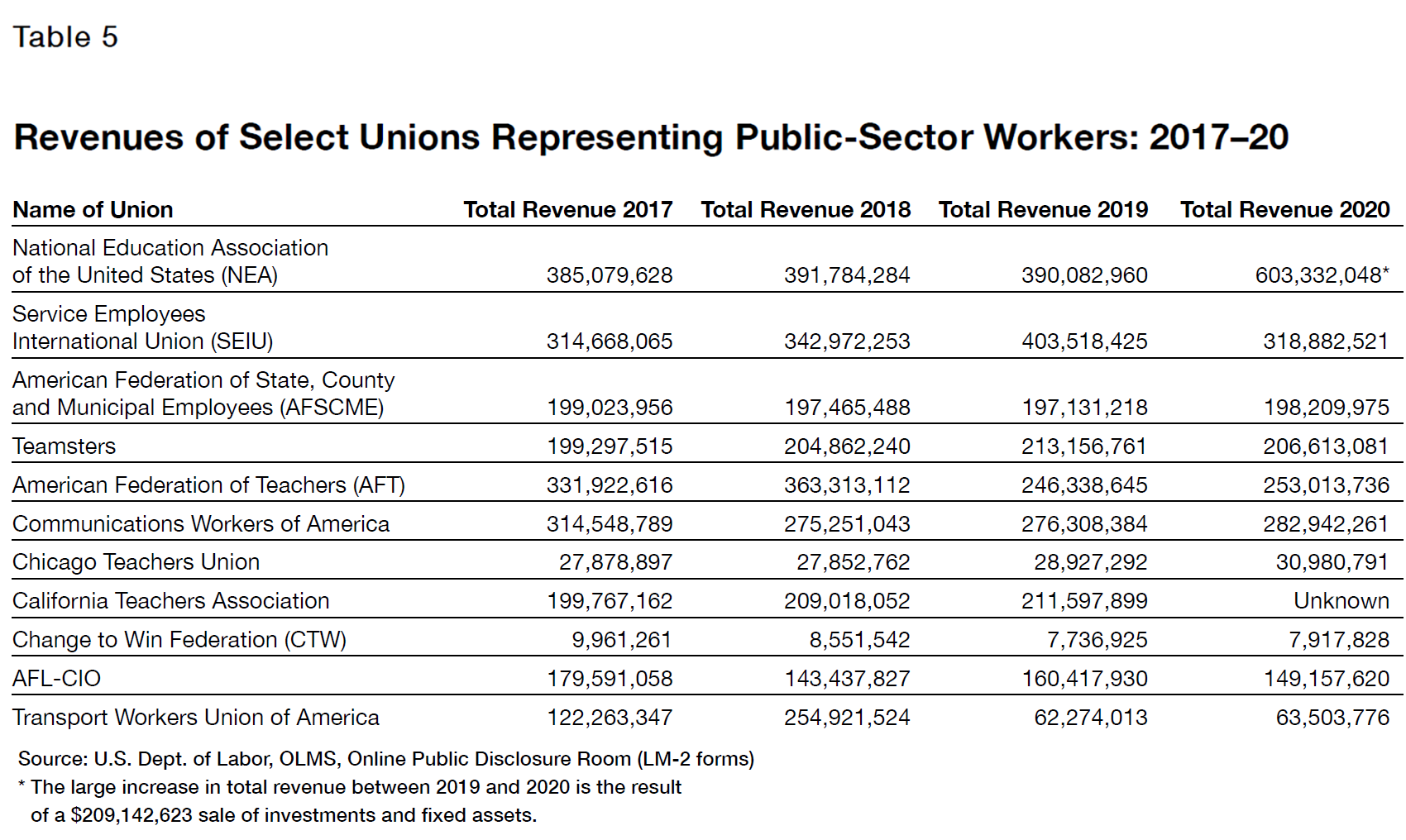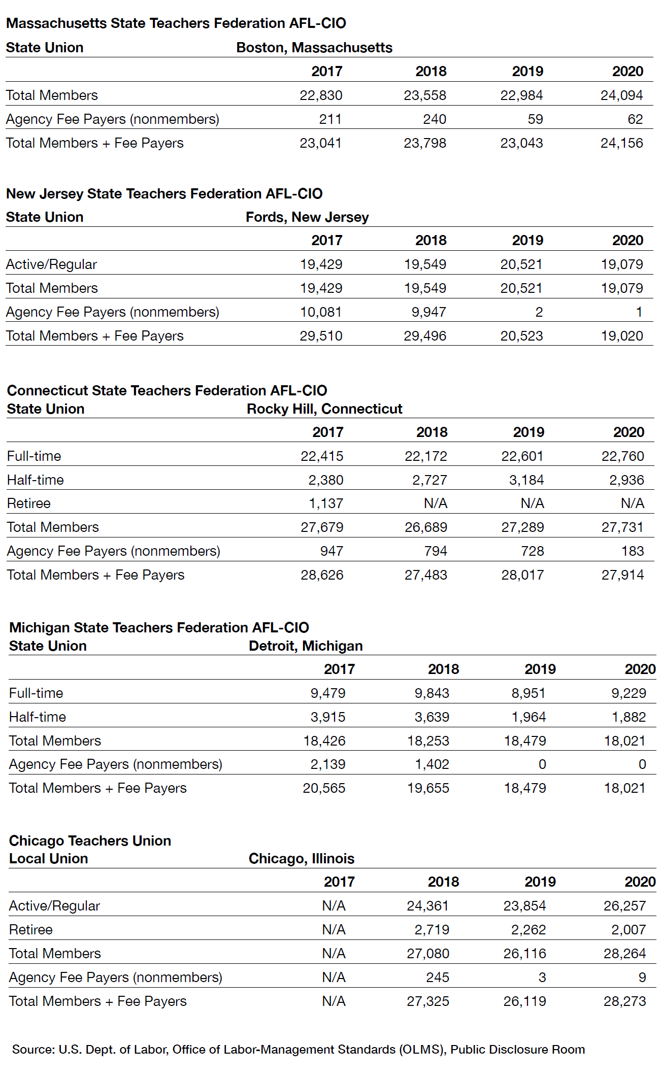 So, like BLS data, LM-2 reports show relative stability in union membership. Where there were large declines, however, it is unclear how much of this was due to employees voluntarily opting out of unions to avoid agency fees or to reductions in the size of the workforce represented by a particular union. That cannot be determined because OLMS does not require a union to indicate how many employees it represents but only the number who are members. So reports showing declines in teachers union members for 2020–21 may simply reflect a pandemic-induced fall in teacher employment or a larger secular trend of shrinking schools as student populations decline.