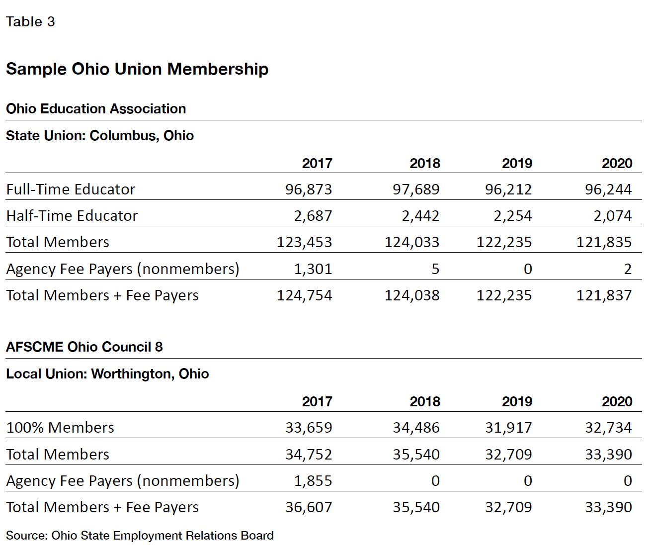 Ohio is the only state to require extensive reporting by public-sector unions that operate within its borders. Yet it is not easy to separate public- and private-sector union members in the Ohio data because private-sector unions can and do represent public-sector workers. Nonetheless, Ohio data do provide a good picture of particular unions that are composed of many, if not all, public employees (Table 3). Consider that the Ohio Education Association (OEH), the statewide teachers’ union affiliate of NEA, had 96,873 full-time educator members in 2017 and 96, 244 in 2020 (the last year for which data are currently available). This suggests, again, a very small drop in union membership. OEH did, however, report losing 1,301 agency fee payers due to the Janus decision. If one can generalize from the experience of OEH, most public-sector unions in Ohio have not seen steep drops in membership.