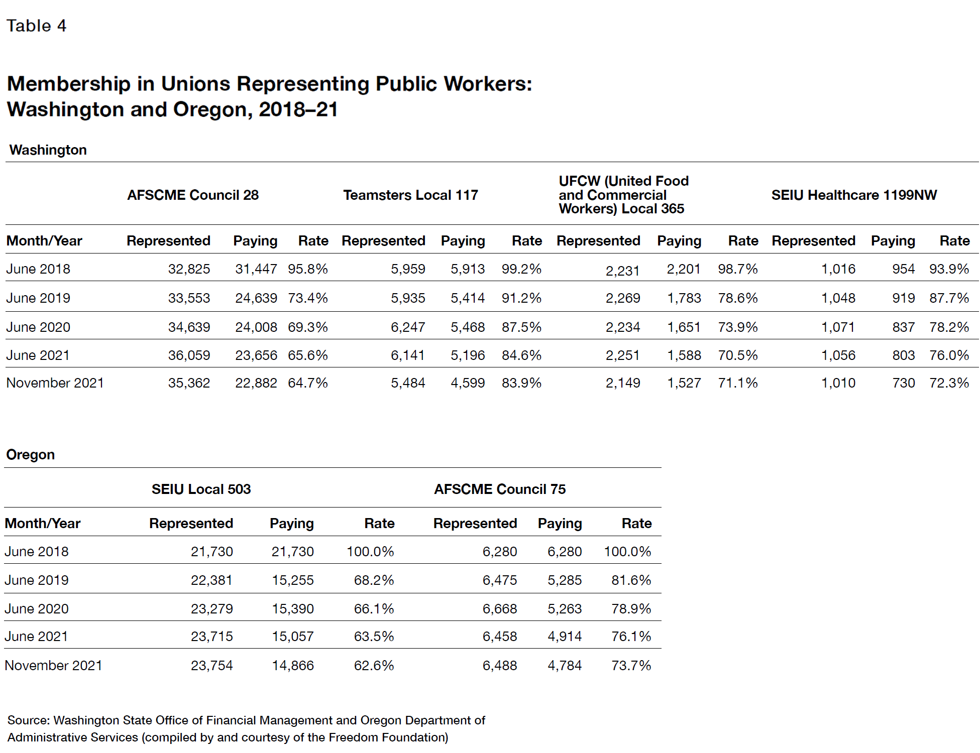 Contrary to the other data sources, the government employer data from these two states show greater declines in public-union members for specific unions (Table 4). For example, Washington’s AFSCME Council 28, which represents a variety of public employees across the state, saw its dues-paying membership fall from 95.8% of represented employees in June 2018 to 64.7% in November 2021 (the last month for which data are currently available). This was during a period when the state had increased the number of employees represented by the union. In Oregon, SEIU 503, which represented 23,754 state employees in November 2021, had a paying membership of only 62.6%—down from 100% in June 2018, prior to Janus, when agency fees were permissible.