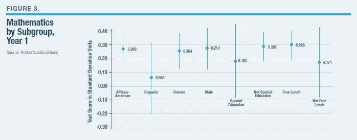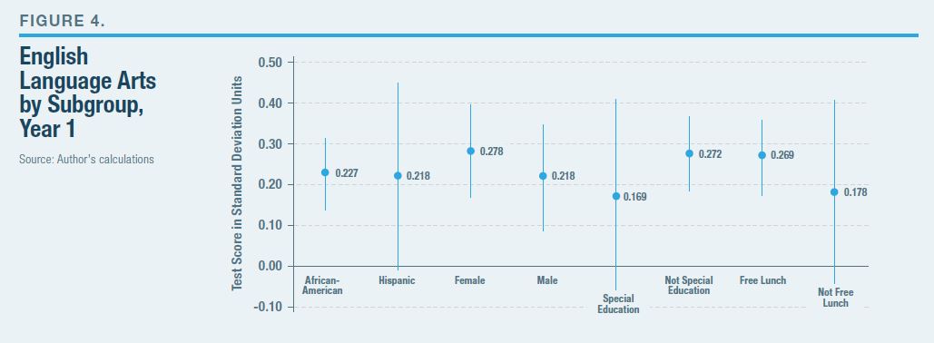Figures 3 and 4 report the results from analyses that separately measure the effect of enrolling in a charter school on student scores in math and ELA, broken down by gender, race, special-education status, and qualification for free lunch. There appear to be some differences in the effect of enrolling in a charter school by student subgroup, though the models are estimated too imprecisely to detect the differences as statistically significant. Notably, the estimates are uniformly positive and, in several cases, are statistically significant. With the exception of Hispanic students on the math exam, the confidence intervals suggest that the analysis can credibly rule out that enrolling in a charter school negatively affected student test-score outcomes.