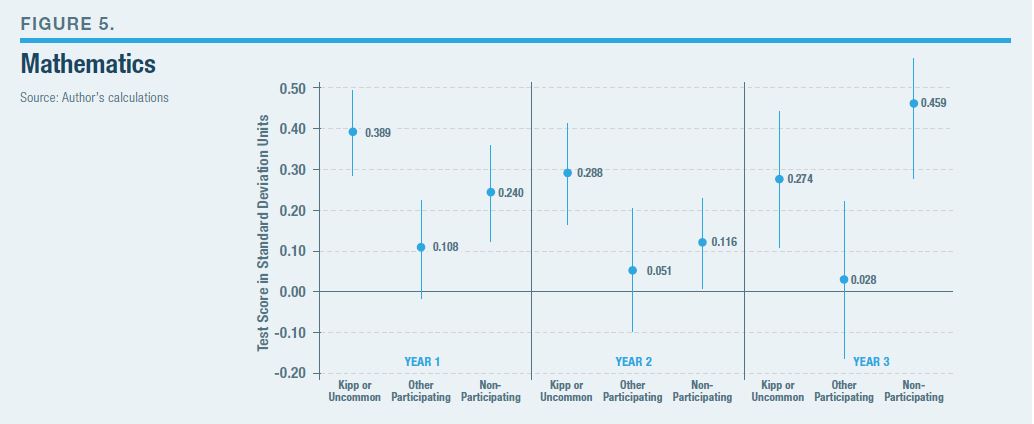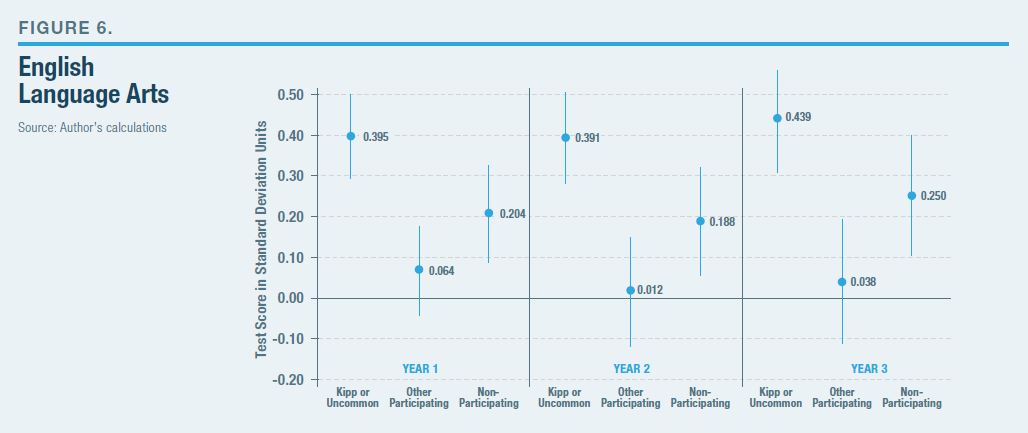 Enrolling in a charter school operated by KIPP or Uncommon leads to statistically significant, and quite large, improvements in student math and ELA scores. Participating charter schools operated by other entities, by contrast, do not produce a statistically significant effect on student ELA scores, on average. I do find evidence of a positive initial effect in math from attending a participating charter school not operated by KIPP or Uncommon; this effect narrowly misses the threshold for statistical significance, at the 5% level illustrated in the figure, but is statistically significant at the 10% level. The magnitude of this effect is meaningful, though significantly smaller, than that of attending a charter school operated by KIPP or Uncommon.