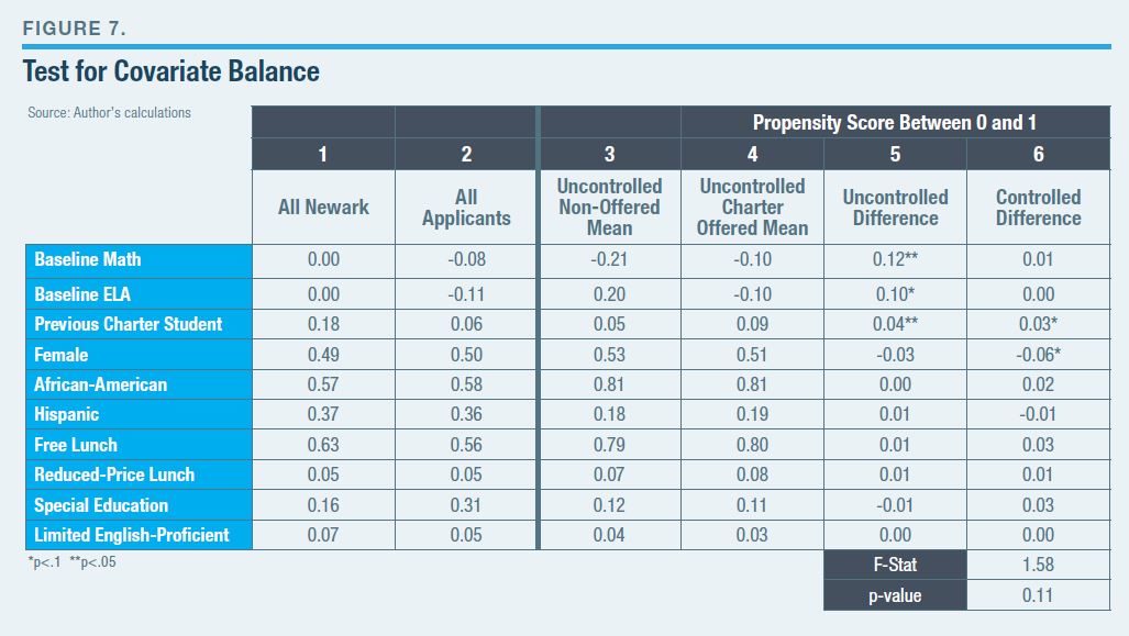 The central assumption behind the strategy employed in this report to identify the causal effect of enrolling in a charter school is that conditional on all the factors controlled for directly in the analysis, assignment to a charter school is associated with charter enrollment but has no other impact on student outcomes. In addition to providing descriptive statistics overall, Figure 7 reports the results of a test for covariate balance meant to address the plausibility of this assumption.