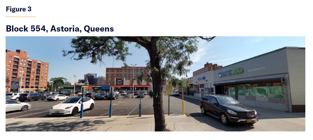 This 112,000-square-foot city block, at the intersection of Broadway and 21st Street, consists of one-story retail stores and a parking lot, all in common ownership (Figure 3). The block is surrounded by dense apartment buildings and is a short walk from the 31st Street/Broadway subway station (N, W trains) and the Steinway Street subway station (M, R trains). The block has failed to redevelop under the pre-COYHO zoning, perhaps because the retail stores, if rebuilt as part of new apartment buildings, would have had to provide large amounts of parking for what would likely be largely a walk-in clientele. Additional parking would have needed to be provided for the residential units.[23]