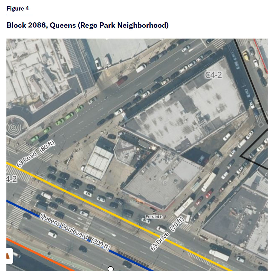 This block (Figure 4) represents another failure of the 1961 zoning. Sitting immediately adjacent to the 63rd Drive local stop on the Queens Boulevard subway line (M, R trains) in the Rego Park neighborhood, it comprises three lots totaling about 41,200 square feet and is developed just as it was in the early 1960s. On the corner of Queens Boulevard and 63rd Road (Lot 22) is a one-story gas station and auto-repair business; immediately adjacent on the Queens Boulevard frontage is a one-story row of small stores (Lot 18); and behind both is a two-story retail and office building (Lot 1).