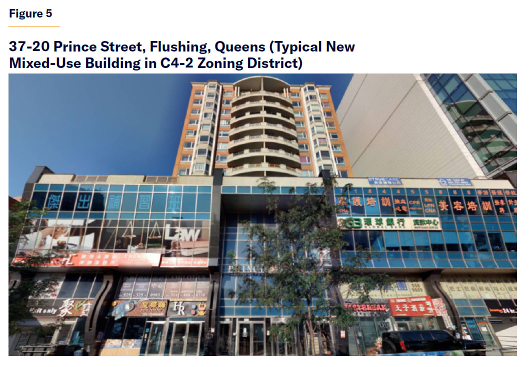 The block is zoned C4-2 and allows apartments above a commercial base.[30] Figure 5 shows a 15-story building at 37-20 Prince Street in nearby Flushing, Queens, in the same C4-2 zoning district, completed in 2008. That building has 72 dwelling units and four floors of commercial and community facility space. A similar building could have been constructed under the pre-COYHO zoning on the Rego Park site.
