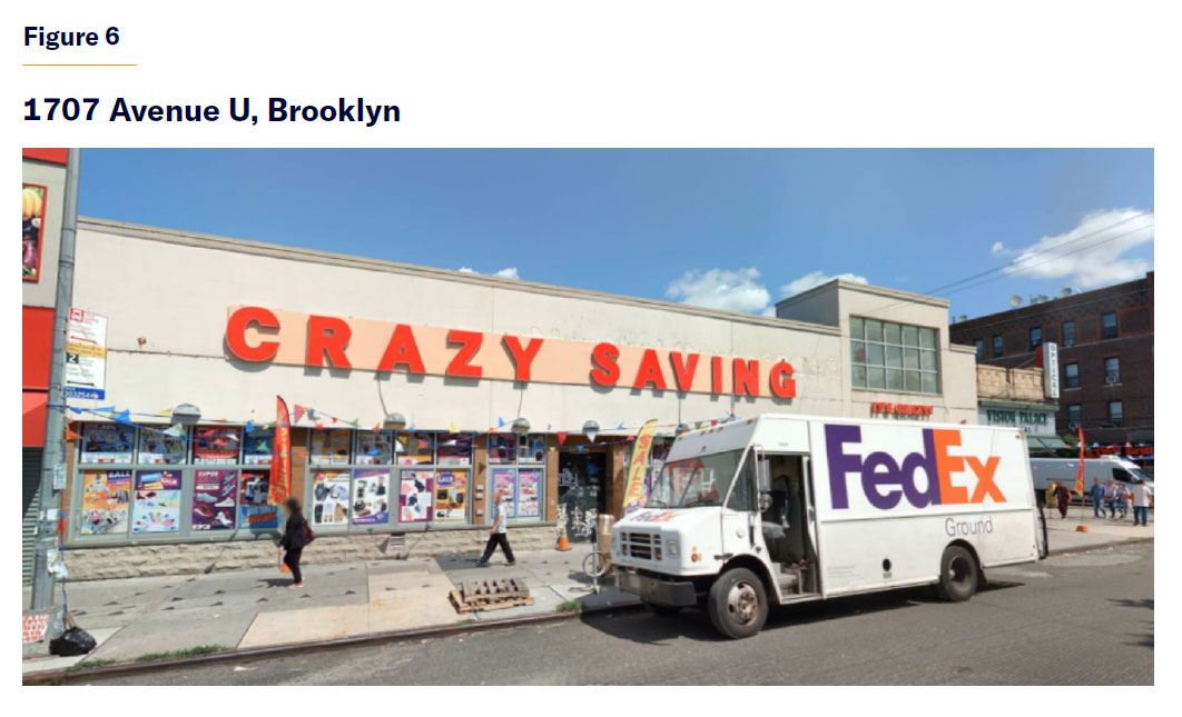 This single-story retail building, mostly occupied by a discount store (Figure 6), dates from 1928. Pre-COYHO zoning combined limited residential floor area and a high parking requirement[38] to preserve the present use, despite the presence of a subway station a block away (Avenue U, Q local). Large apartment buildings abound in the neighborhood that were constructed in more fortunate days of liberal zoning. Just up the adjoining street, for example, a six-story, 59-unit building stands at 2050 East 18th Street (Figure 7). As is true for many older buildings in the neighborhood, the residents of this attractive art deco building have managed for decades without onsite parking.