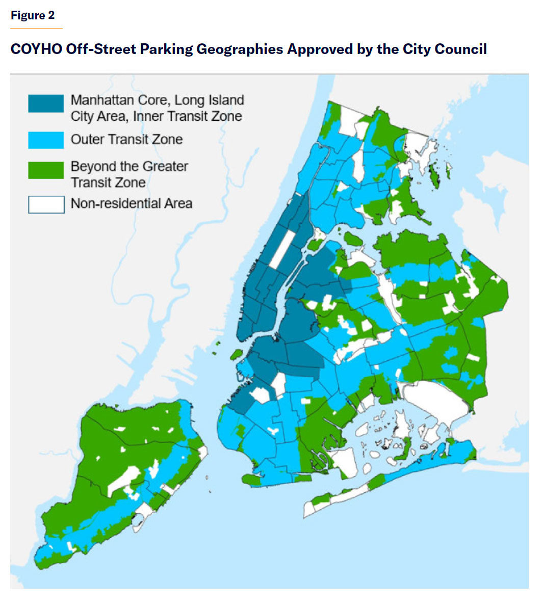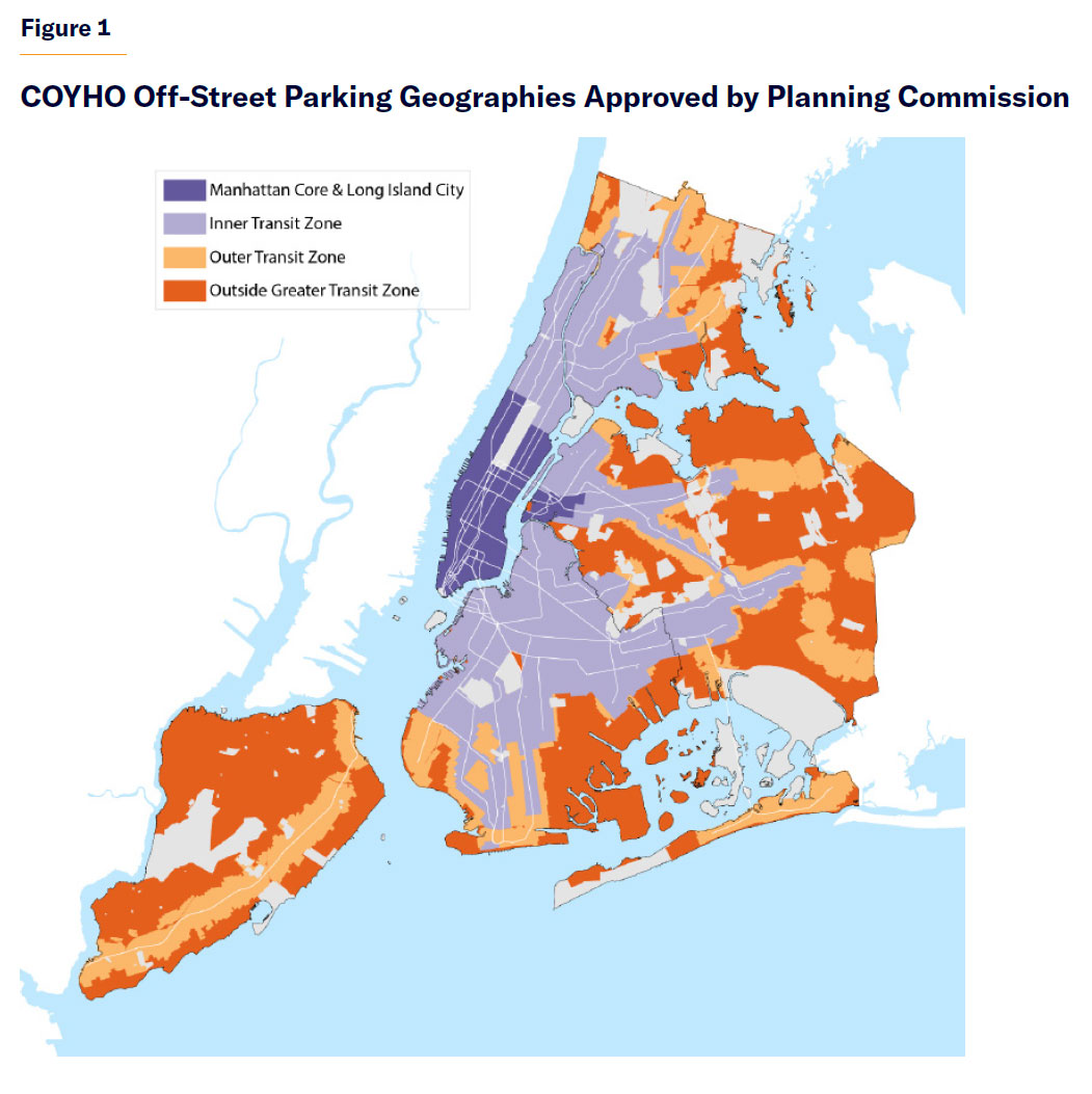 COYHO, as passed by the City Planning Commission, would have eliminated all off-street parking requirements for both residences and nonresidential space. This would have allowed a developer that assembled the Rego Park block to determine the most profitable number of parking spaces to provide, based on market demand and the costs of garage construction.