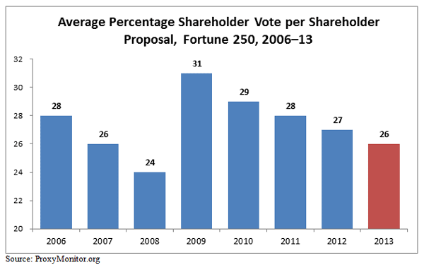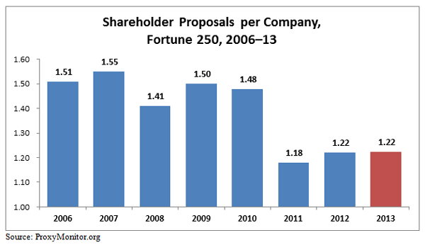 In 2013, the 250 largest American companies faced 306 shareholder proposals that made proxy ballots, a rate of 1.22 per company—unchanged from 2012. The number of shareholder proposals remained significantly below that witnessed in the five years through 2010, when Dodd-Frank’s rule mandating shareholder advisory votes on executive compensation meant that shareholders seeking that rule no longer needed to introduce such proposals.