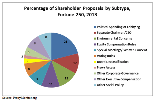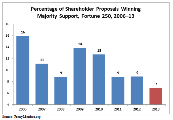 In 2013, 39 percent of shareholder proposals on proxy ballots involved “corporate governance” questions, most frequently involving separating the company’s chairman and chief executive officer positions; allowing shareholders to act outside annual meetings through special meetings or by written consent; and modifying the company’s voting rules. Several of these proposals related to traditional corporate governance issues were likely to win significant shareholder support, including those seeking to elect the full board of directors annually (seven of eight such board-declassification proposals received majority support) and those seeking to eliminate all supermajority-voting requirements in the company’s bylaws (six of seven such “simple majority voting” proposals received majority support). Two (of seven) proposals seeking to require directors to obtain a majority vote for election received majority backing, as did two (of seven) seeking to allow shareholders to nominate their own directors on corporate proxy ballots (“proxy access”); two (of seven) seeking to allow shareholders to call special meetings; two (of 38) seeking to separate the company’s chairman and CEO positions; and one (of 20) seeking to permit shareholders to take action by written consent.