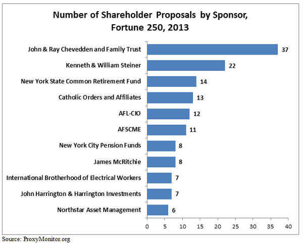 In 2013, 39 percent of shareholder proposals on Fortune 250 companies’ proxy ballots were sponsored by individual investors; 35 percent by pension funds affiliated with multi-employer labor unions, or for state or municipal workers; 25 percent by social-oriented institutional investors created to invest with a social purpose, or affiliated with a religious or public policy organization; and 1 percent by other institutional investors. Two individuals and their family members and trusts—John Chevedden (see box below) and Kenneth Steiner—sponsored a majority of all shareholder resolutions proposed by individual investors, and 23 percent of shareholder proposals overall. (Among all other shareholder proposals sponsored by individual investors (16 percent of the total), 39 percent were introduced by just three more individuals: James McRitchie, Gerald Armstrong, and John Harrington.) Of the pension funds sponsoring shareholder proposals, the public-employee pension funds for New York State and City and the pension funds for the American Federation of Labor–Congress of Industrial Organizations (AFL-CIO) and the American Federation of State, County, and Municipal Employees (AFSCME) were most active. Catholic orders of nuns were also active in sponsoring shareholder resolutions. Among the many social-investing funds sponsoring multiple proposals, Northstar Asset Management was most active.