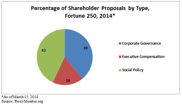 The mix of shareholder proposals in the 45 Fortune 250 companies filing proxy materials by mid-March is roughly in line with that seen in 2013 and recent years, with a plurality of all proposals relating to social policy concerns. Some 20 percent of all proposals introduced to date have involved corporate political spending or lobbying, in keeping with 2012 and 2013 levels. The next-most-introduced class of proposals calls for separating the chairman and CEO roles, also in keeping with 2012 and 2013.