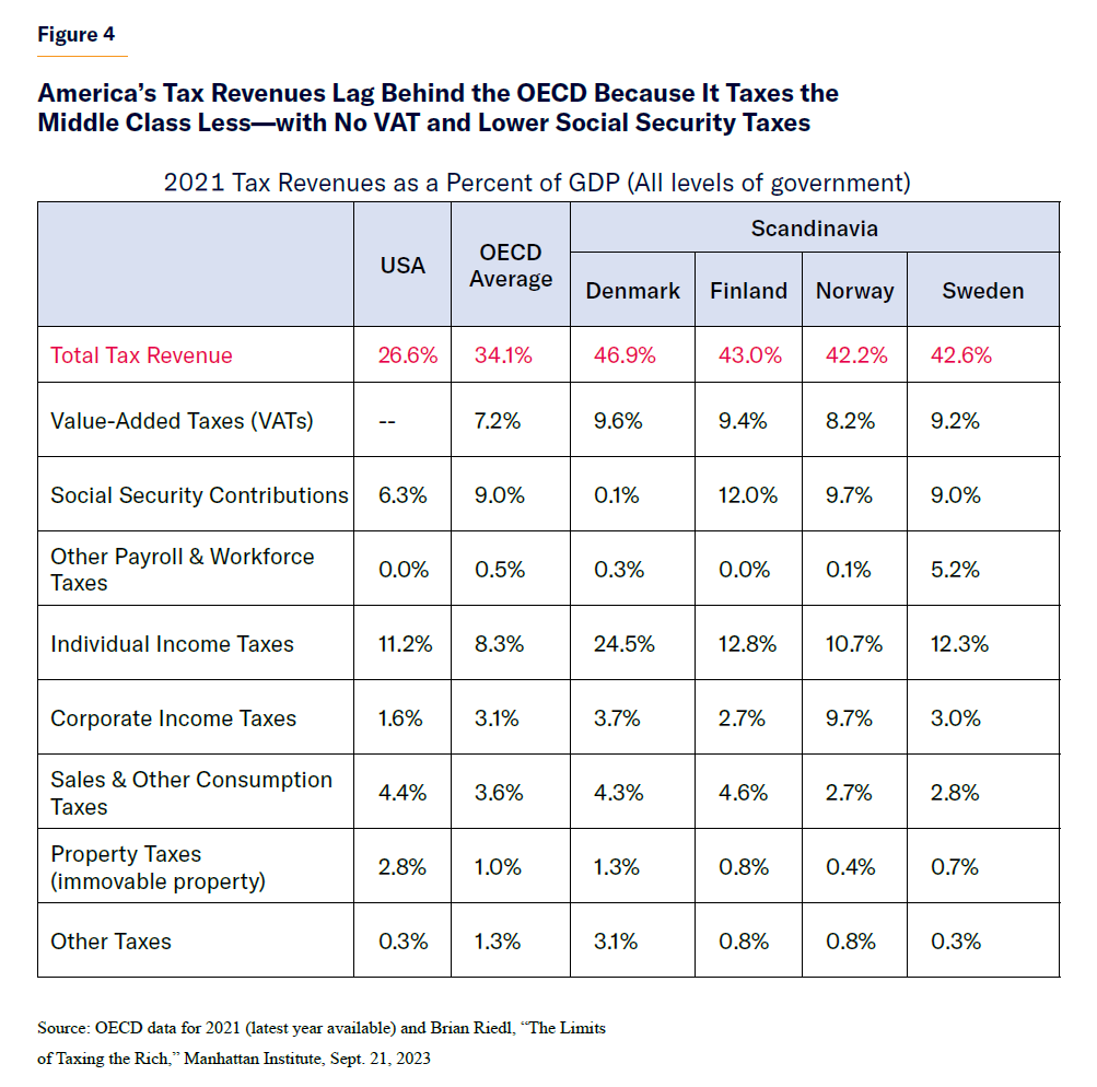 A similar dynamic holds when comparing the U.S. with the other 37 OECD nations, which collect an average of 34.1% of GDP in tax revenues, compared with America’s 26.6%. Yet VAT revenues—which average 7.2% of GDP in OECD, versus none in America—account for nearly the entire difference. A total of 37 of the 38 OECD nations—all except the U.S.—impose VATs at rates ranging from 5% (Canada) to 27% (Hungary). The Scandinavian nations of Denmark, Finland, Norway, and Sweden each have VAT rates of about 24%–25% that collect an average of 9.1% of GDP, or roughly one-fifth to one-quarter of their total tax revenues. VATs (and, to a lesser extent, payroll taxes)—which are not particularly progressive—drive the vast majority of Europe’s tax-revenue advantage over the United States. Mimicking Scandinavia’s 9.1% of GDP in VAT revenues would require American taxes of $2.4 trillion per year, or nearly $18,000 per household.[19]