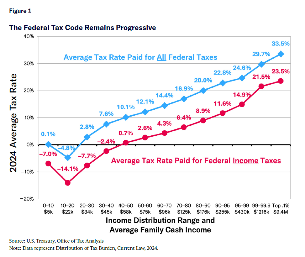 The same chart includes IRS data on the average of all federal taxes paid—income, payroll (including the employer side), corporate, estate, and excise taxes. With these included, the tax code remains progressive, with the bottom-earning 20% paying negative federal taxes, middle-earners paying about 11% of their income in federal taxes, and the top-earning 1% paying a nearly 30% tax rate.[7]