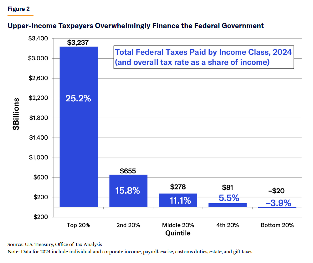 Thus, the wealthy overwhelmingly fund the federal government. In 2024, the top-earning 20% paid just under $2 trillion in income taxes, while the second quintile contributed $228 billion. The remaining 60% of earners, by contrast, paid a collective income tax of negative $92 billion. Across all federal taxes, the top-earning quintile paid $3.2 trillion, while the remaining four quintiles paid $655 billion, $278 billion, $81 billion, and negative $20 billion, respectively (see Figure 2). Put another way, the top-earning quintile funded 201 days of 2024 federal spending, the next quintile funded 41 days, and the bottom-earning 60% of families collectively funded 21 days of spending (the remaining 103 days were financed with budget deficits and borrowing).[10] The notion that middle-earner taxes finance the federal government, while most wealthy families escape taxes, is simply preposterous.