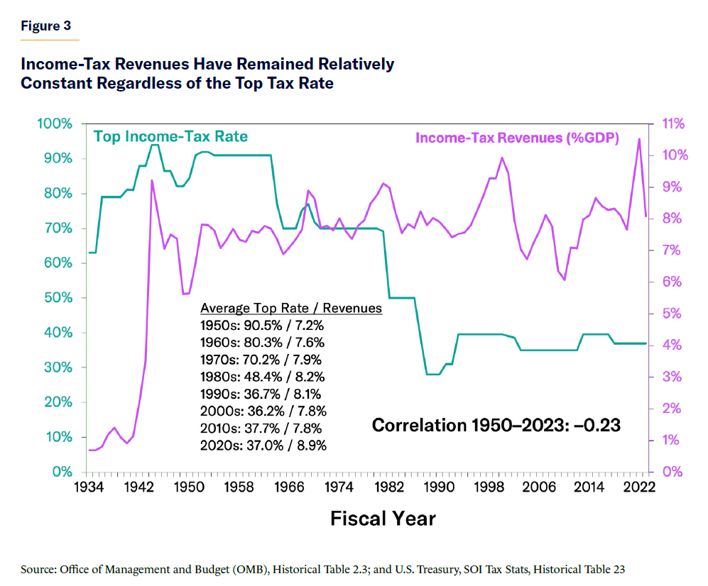 Simply put, Washington collects more income-tax revenues (as a share of GDP) today with a top tax bracket of 37% than it collected in the 1950s with a 91% tax bracket. In fact, since 1950, the yearly correlation between the highest income-tax bracket and federal income-tax revenues as a share of the economy is –0.23, meaning that higher top tax rates are correlated with lower income-tax revenues.
