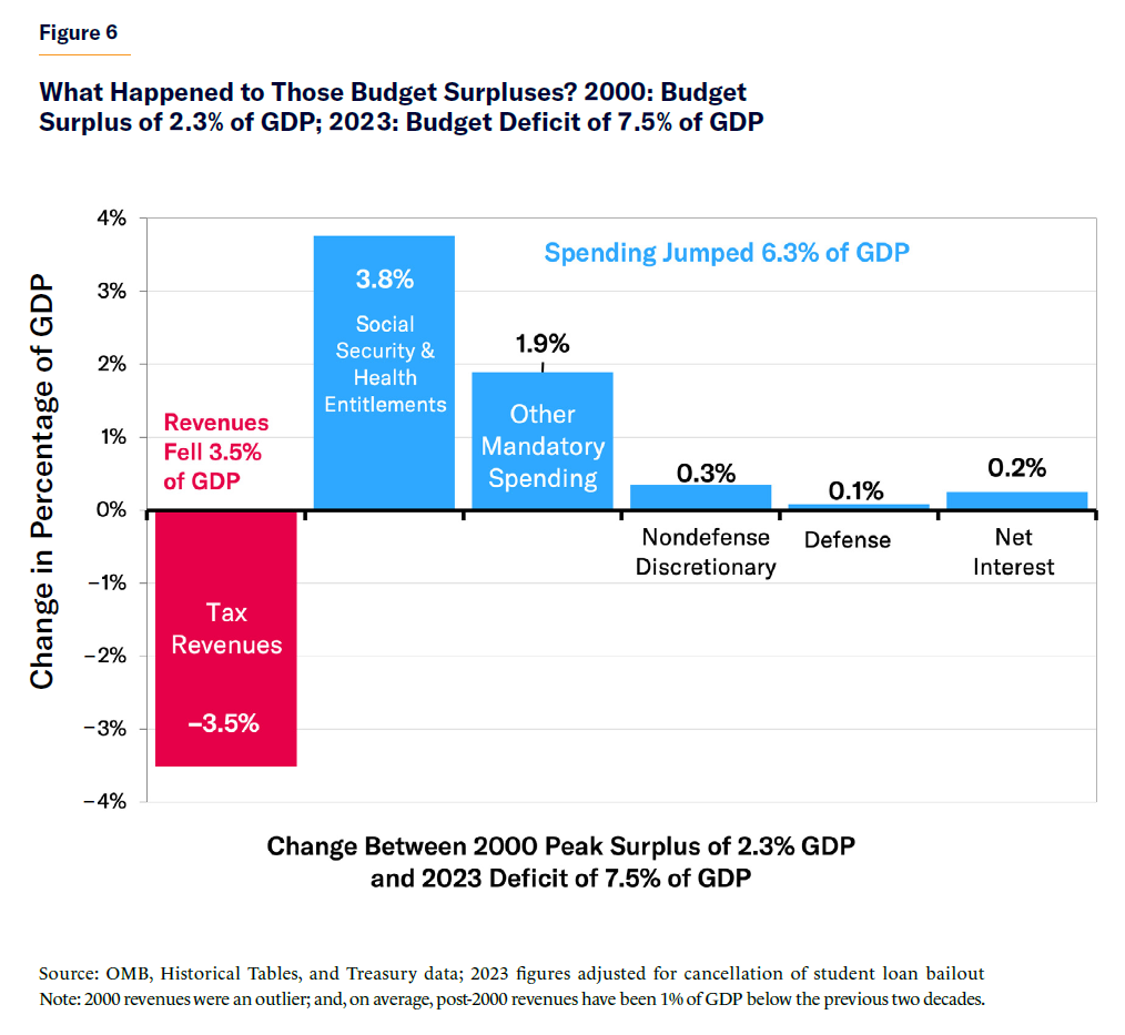Another leading progressive myth is a reflexive tendency to blame virtually all budget deficits on Republican “tax cuts for the rich.” The budget math shows otherwise. Between 2000 and 2023, Washington’s annual fiscal position declined by 9.8% of GDP (from a 2.3% of GDP budget surplus to a 7.5% budget deficit).[21] This decline was driven by annual spending rising by 6.3% of GDP; the bursting of the 2000 revenue bubble, which reduced long-term revenues by 1.5% of GDP; and tax cuts costing 2.0% of GDP. Furthermore, more than two-thirds of the benefits from those tax cuts were distributed to middle- and lower-income families. That means that “tax cuts for the rich” have cost the federal budget 0.6% of GDP since 2000, out of a 9.8% of GDP shift from annual budget surpluses to deficits. Spending increases, economic factors, and tax cuts for the non-wealthy account for the remaining 9.2% of GDP fiscal decline (see Figure 6).